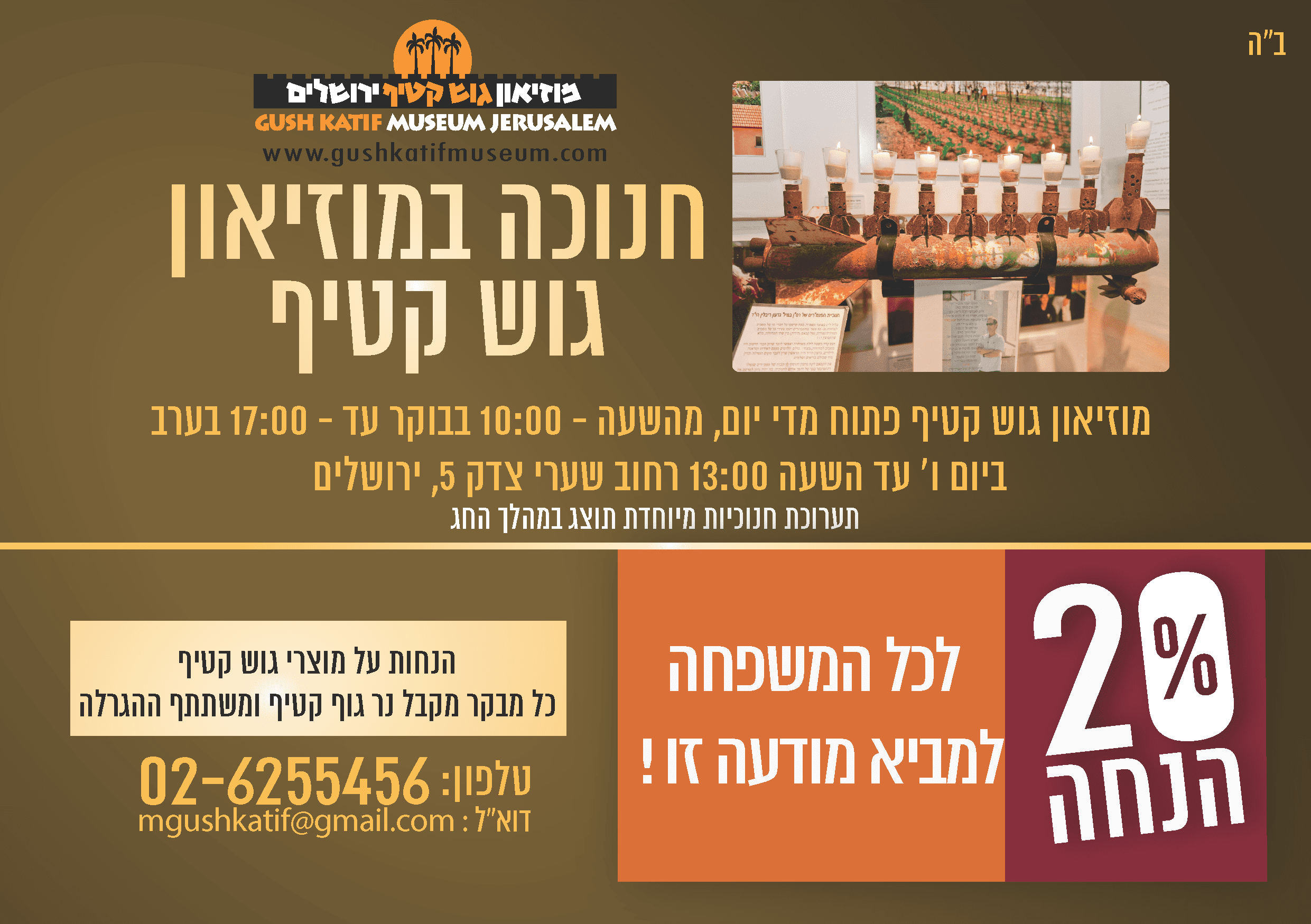 חנוכה במוזיאון גוש קטיף: "מהחשמונאים ועד גוש קטיף" במהלך ימי החנוכה ייפתח מוזיאון גוש קטיף בירושלים לקהל הרחב, והשנה חג החנוכה יהיה בסימן מתקופת החשמונאים